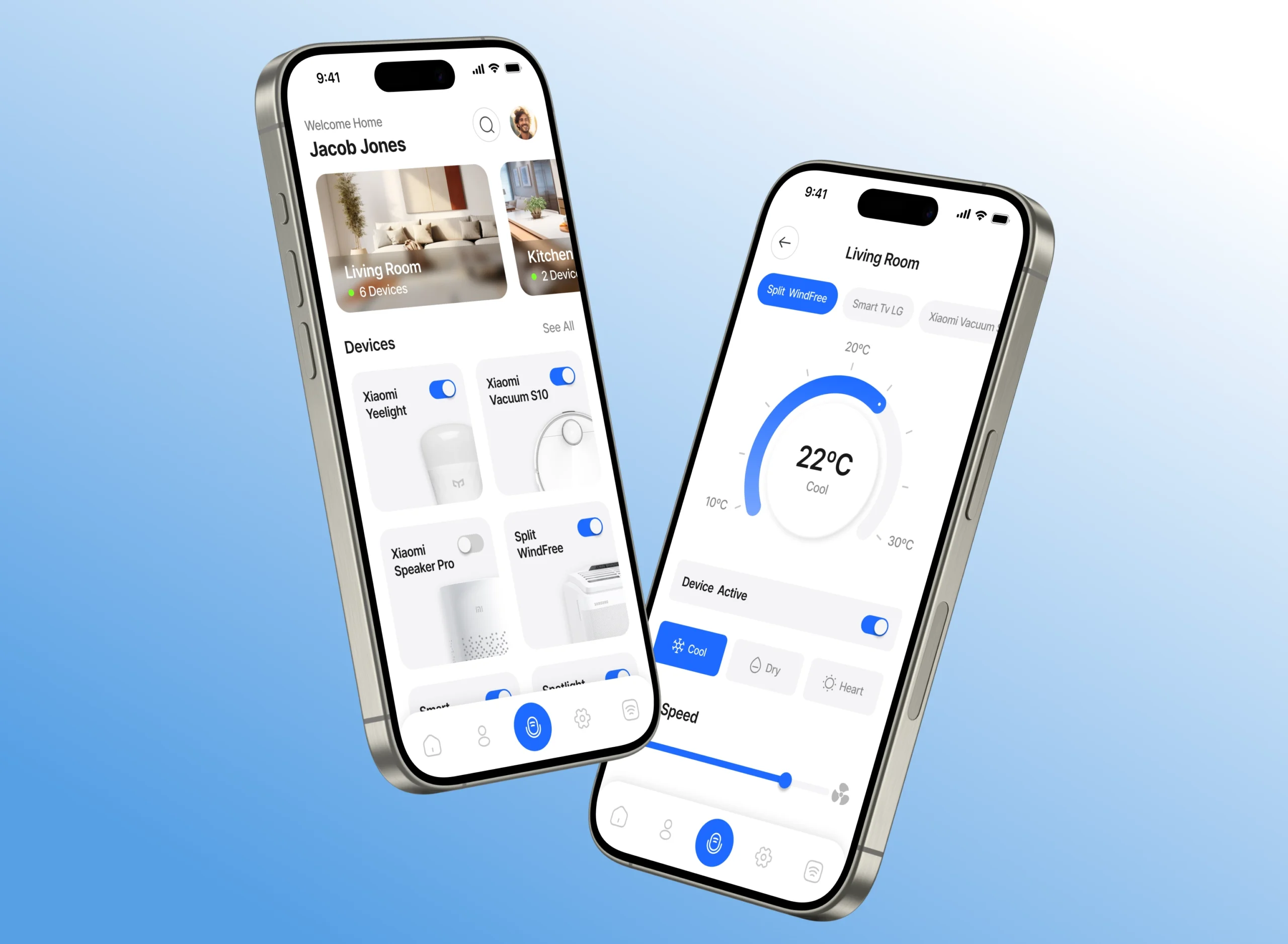 Desenvolvi uma interface unificada baseada em cartões para agilizar o acesso aos dispositivos essenciais. A navegação prioriza a ergonomia, destacando-se pelo controle circular de temperatura e um design minimalista em tons de azul e branco, garantindo uma experiência fluida e sem distrações visuais.